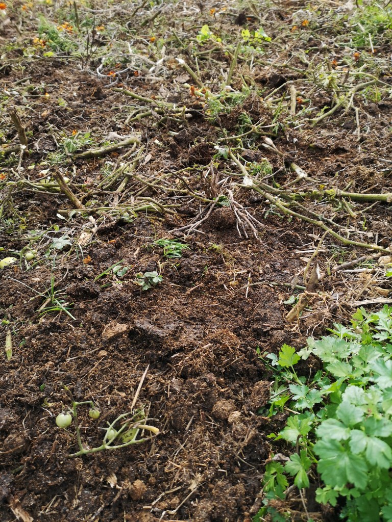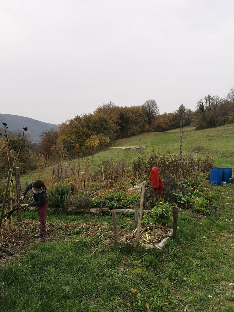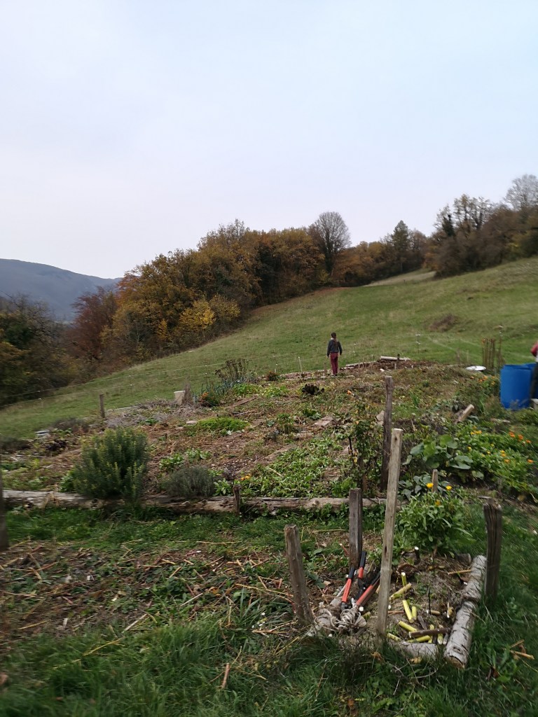 - Les récoltes de l’automne sont quasi terminées, on découpe les restes de plants de légumes et de fleurs directement sur place sur place et on les laisse au sol.