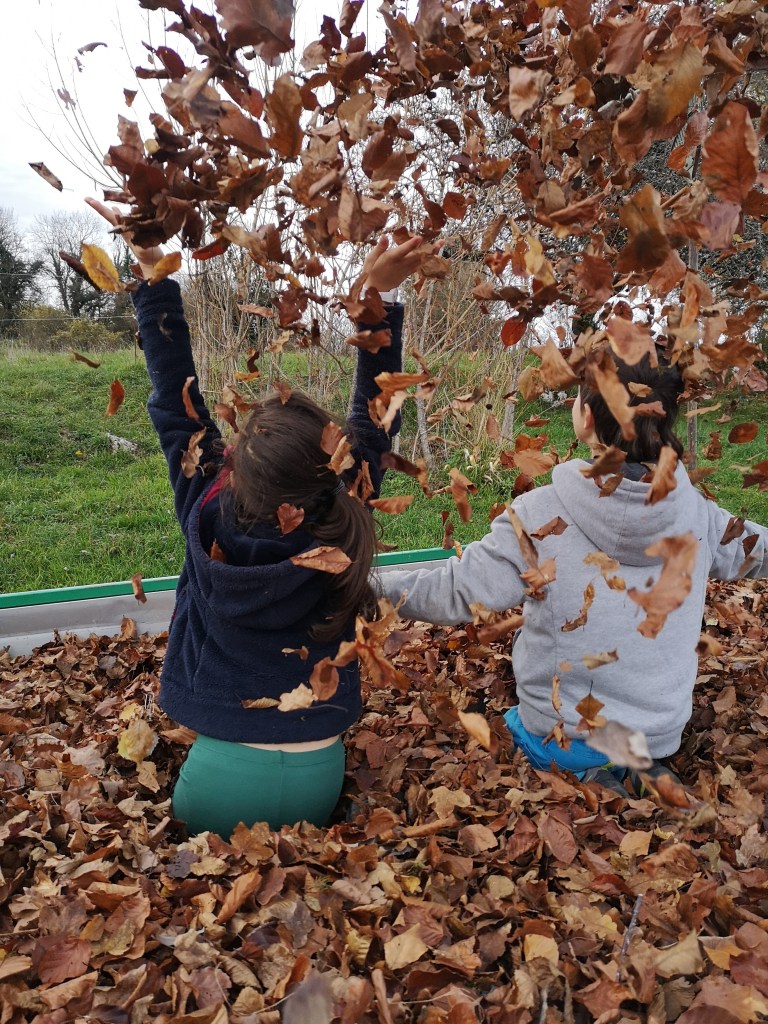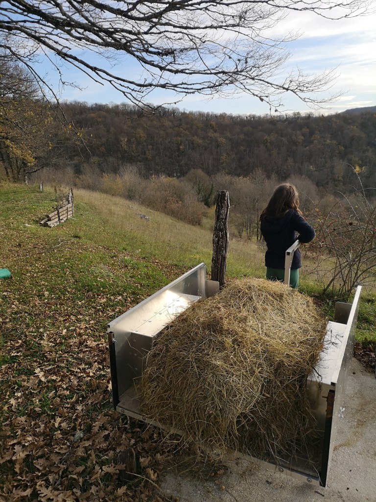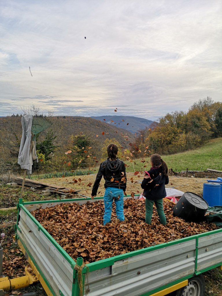3. C’est le moment d’aller chercher la matière carbonée. Pour nous c’était donc feuilles et vieux foin. Je précise que quand on prélève des feuilles en forêt on le fait avec parcimonie, en changeant régulièrement d’endroit pour ne jamais mettre le sol forestier à nu. Bref pas question de déshabiller Pierre pour habiller Paul!