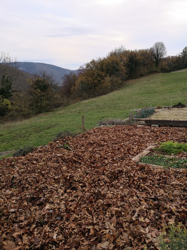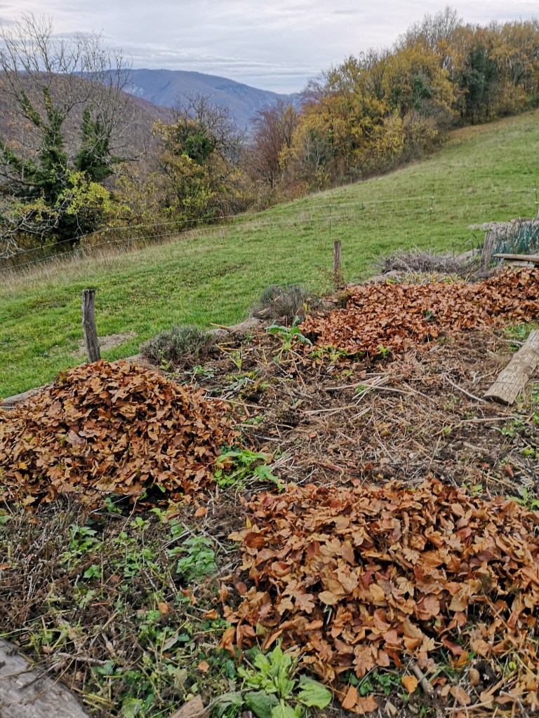 Par exemple, moi qui habite dans une région de moyenne montagne dans laquelle il n’y a quasi pas de culture de céréale, je ne vais pas mettre de paille. Même si c’est écrit dans les livres ou en photo sur les réseaux sociaux. Parce que ce n’est pas une ressource directement disponible pour moi et que je serais obligée de la faire venir en camion depuis une autre biorégion que la mienne. Par contre, il se trouve que mon voisin se débarrasse de vieux foin qui trainait dans sa grange et que mon jardin est en bordure d’une forêt de plusieurs centaines d’ hectares… Pour notre jardin familial ce sera donc foin + feuilles mortes.